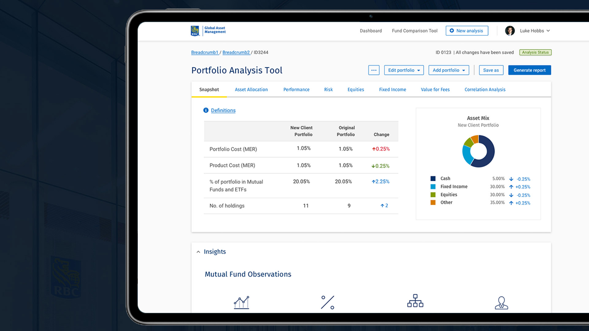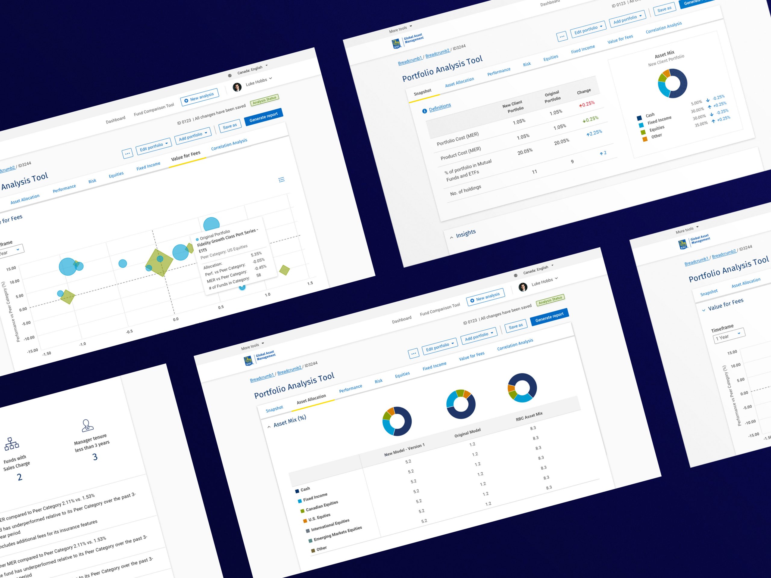 Key features included the capacity to compare costs, asset allocation, performance, and risk characteristics of a client’s existing portfolio with an ideal portfolio, based on unique strategies.